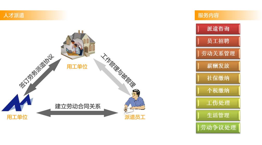 指用工单位通过中北盛世选聘急需的人才,并由中北盛世分别与用工单位和派遣人员签订人才派遣合同和派遣员工合同,以规范三方在派遣期间的权利与义务,同时,通过中北盛世为所聘员工发放薪酬、代办社会保险、管理档案等一种新型的用人方式。